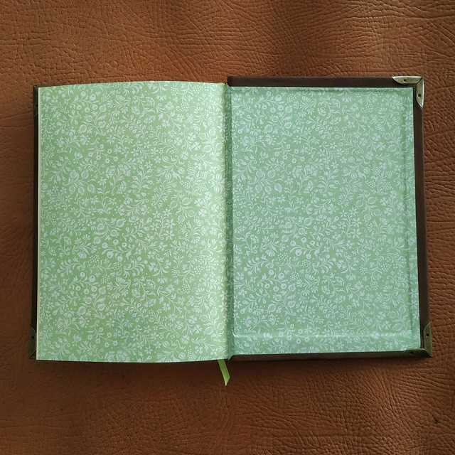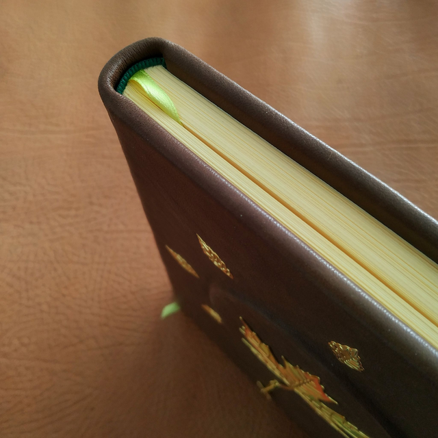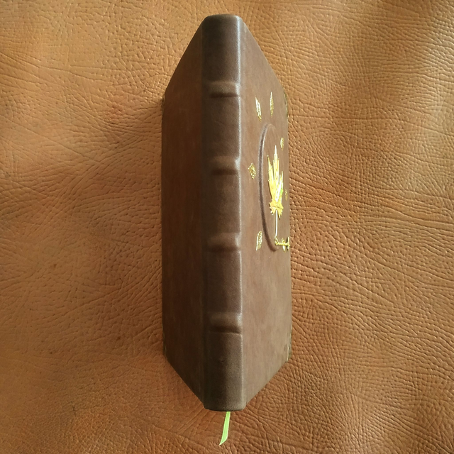 Ce grimoire plein cuir, au toucher doux, est inspiré de l'automne. Entièrement relié à la main au format A5, il est doté d'une couverture rigide et de nerfs sur le dos, à l'image des ouvrages anciens. Il se compose de 240 pages de teinte chamois (grammage 80gsm), ce qui lui donne un aspect vintage. Les pages de garde présentent un motif baroque blanc et vert pâle. Son ouverture est large, facilitant l'écriture ou le dessin.